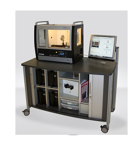 Teaching and performing experiments with the mobile X-ray lab. The mobile X-ray lab saves valuable time by making the set-up and dismantling of experiments in the classroom or lecture hall redundant. All of the important parts, such as X-ray tubes, goniometer, or multi-channel analyser, can be stored safely in the lockable cabinet. Prepare your experiments unhurriedly ahead of time before pushing them into the room at time of the lecture. Cluttered set-ups and tangled cables are a thing of the past: The most important connectors are located on the desktop. The screen is fixed in place on the desktop in a permanent manner in order to protect it against damage and theft. The extra-large castors easily surmount any edges or bumps. Any type of room can be instantly transformed into an X-ray science lab!