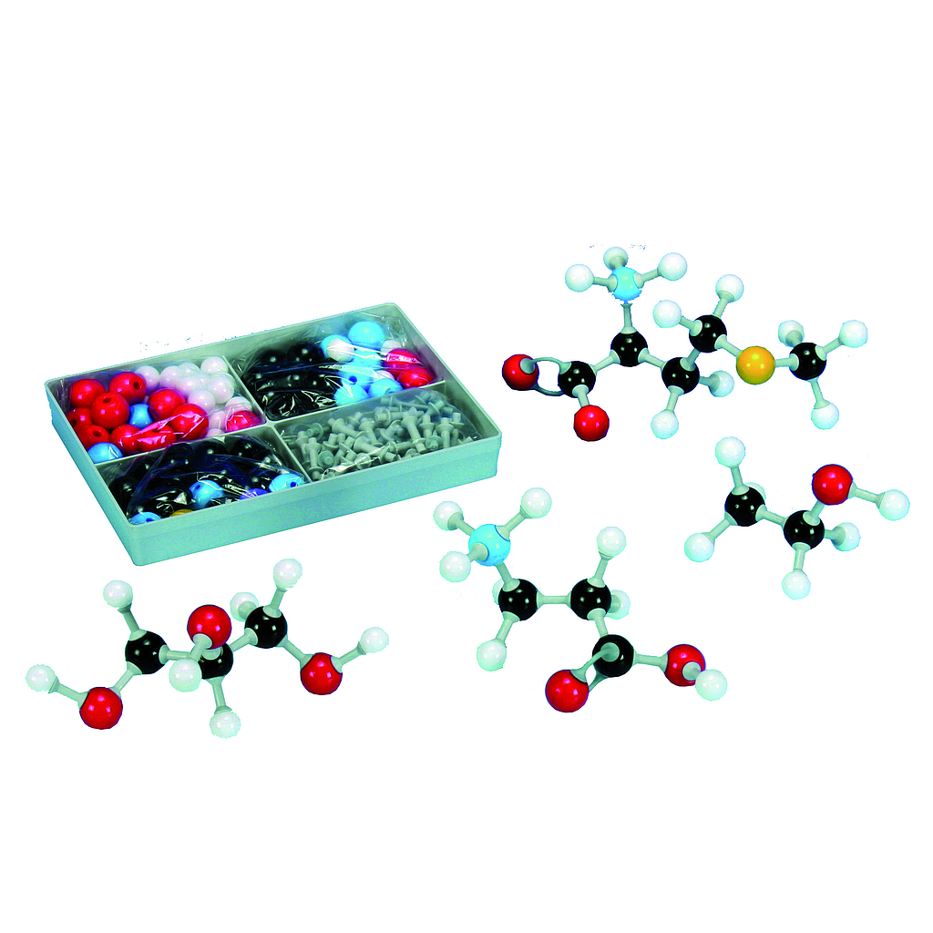 The kit contains all needed elements and connections for ball-and-stick models of organic and inorganic standard molecules.