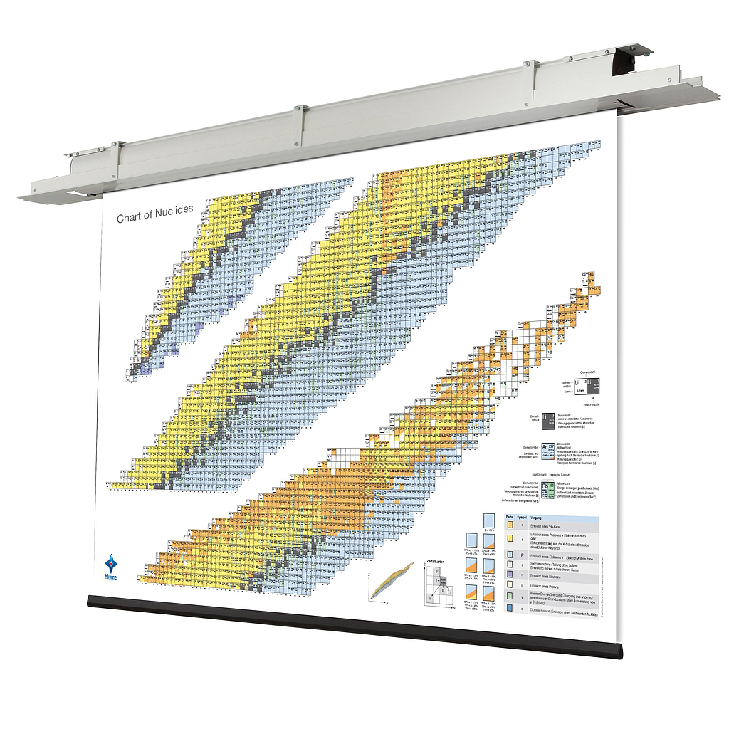 The Moter screen is designed to be readable from a large distance. Suitable for spacious rooms such as lecture halls, the chart of nuclides is characterized by excellent technical and qualitative performance. Optional ceiling installation sets are available for these screens.
