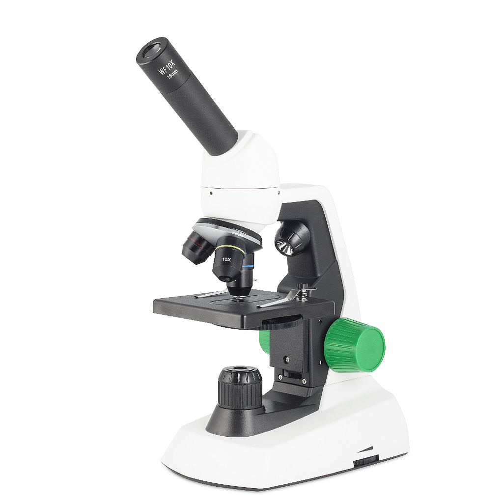 Introductory student microscope with two applications: for microscope slides with transmitted light and other objects with incident light. Monocular, with LED illumination for cordless operation.