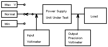 During testing, allow the power supply under test to warm up and stabilize, then measure the output voltage and use it as normal output voltage (Unormal). Additional output voltage reading are then taken with maximum (Umin) and minimum (Umax) loads on the output. Output voltage deviation from normal to full load and minimum load generate the Load regulation.