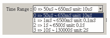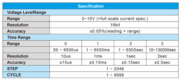User can set Time Range 0~3 or use the oscilloscope to store the actual current waveform (* .CSV), by means of the 9923 application software to read the actual current waveform file (*.CSV) and then download to 9923 Current Waveform Generator to proceed with Electronic load simulation.