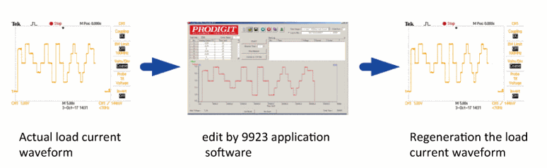 b. Use the oscilloscope's load current waveform (*.csv), after it has been processed by the 9923 application software, then download to the 9923 to simulate current: