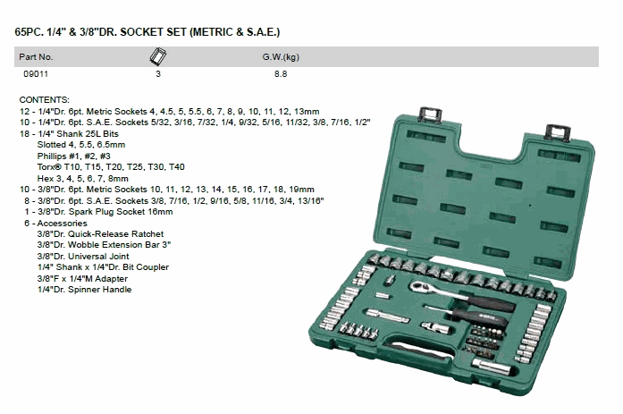 10pc 1/4inch Dr. 6pt S.A.E Sockets: