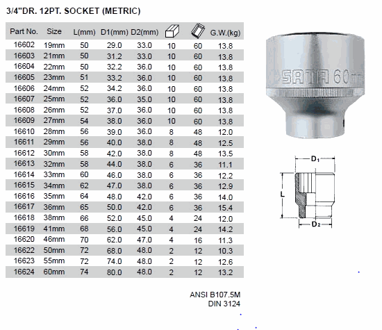 SATA 16609 3/4inch DR.12PT.SOCKET (27mm,3/4inch) | EMIN.CO.TH