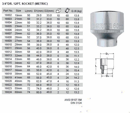 SATA 16615 DR.12PT.SOCKET(S.A.E.)/(METRIC) (34mm,3/4inch) | EMIN.CO.TH