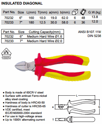SATA 70232 INSULATED DIAGONAL PLIER (6 inch, ø1.6mm, 1000V) | EMIN.CO.TH