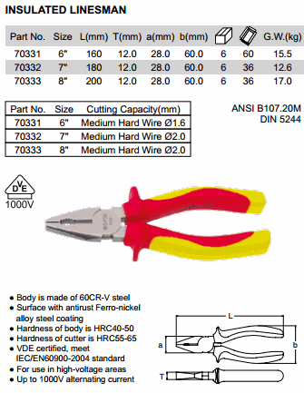 SATA 70332 INSULATED LINESMAN PLIER 7 INCH (180mm, ø2.0mm, 1000V) | EMIN.CO.TH