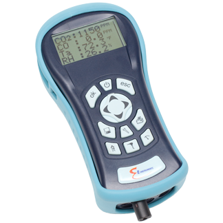 Portable indoor air quality monitoring device type Si-AQ Comfort 04 measuring : CO2 (0-5000ppm) / CO (0-500 ppm) / ambient temperature / relative humidity / wet temperature / dew point temperature / atmospheric pressure. Bluetooth wireless communication for optional printer. Memory of 2000 points. Supplied with calibration certificate, carrying case and software kit + PC cable.