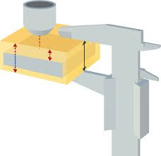 Process: Ultrasound waves are directed onto the test object using a sensor. The waves penetrate the test object, are then reflected from a surface opposite the object and then picked up again by the sensor. The measurement determined by this process will be compared with the material thickness as measured by a traditional calliper gauge. On the basis of the measurement given, false cores (Figure: grey) such as for example, those made of tungsten, lead, etc. can be easily identified, as the ultrasound reacts differently, compared with pure gold
