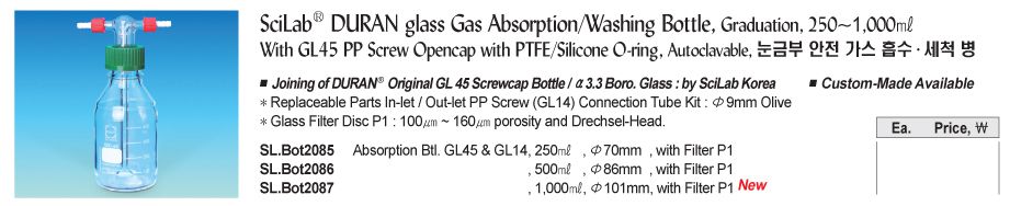 SciLab SL.Bot2085 DURAN glass Gas Absorption/Washing Bottle (GL45Cap, PTFE/Silicone O-ring; w/ filter P1; 250ml) | EMIN.CO.TH
