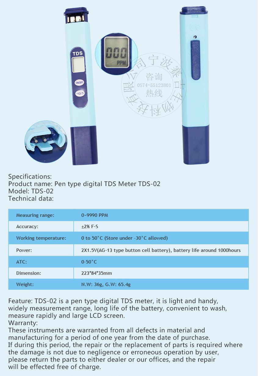 Sinotester TDS-02 TDS Meter (0~9990ppm, ±2% F.S) | EMIN.CO.TH