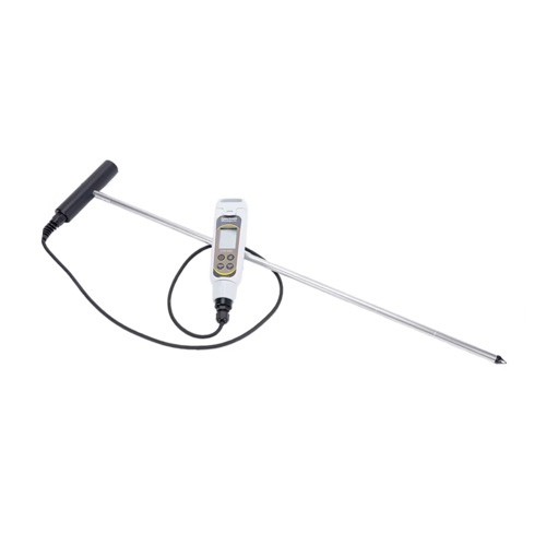 The FieldScout Direct Soil EC Meter with 24" T-Handle Probe provides instant and accurate direct EC measurement. The patented paired sensor tip provides maximum soil sensor contact and higher accuracy. Shows both the parameter and temperature readings simultaneously. No need to prepare samples, simply sample through the profile. Sample directly in plug trays, pots, containers, solutions or ground soils. Backlit LCD displays makes it easy to read in low light conditions. Includes case, calibration standard and (4) AAA batteries.
