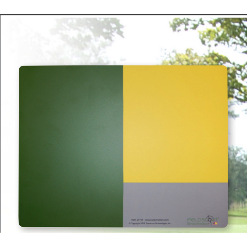 The FieldScout GreenIndex+ Turf Board helps to measure plant health via the chlorophyll content (relative greenness) of turf using the GreenIndex+ Turf app. simply take a photo of a leaf lying across the target board and include the green and yellow standard color disks in the photo. The on the screen, tap the green disk, then the yellow disk, then the leaf and tap Done. Read the results on the screen.