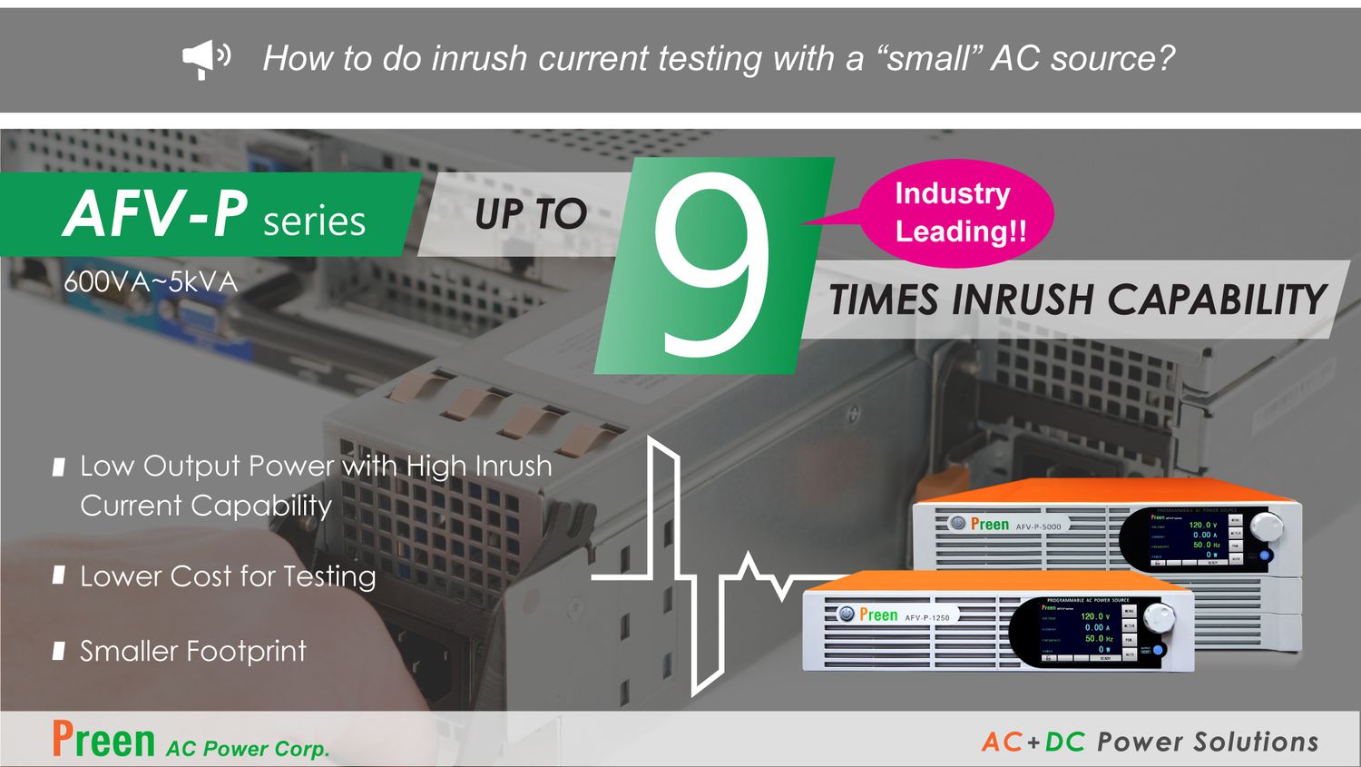 Preen’s AFV-P series, high performance programmable AC power source, provides standard inrush current capability up to 4.5 times of output rated current (Irms) and optional 9 times inrush capability, which makes the AFV-P series the industry-leading AC source that delivers the highest peak current with the smallest output power. It is an ideal AC power source for high inrush current drawn by the switching power supplies and helps users to effectively save the cost and space. Moreover, the users can set the start and end angle with the AFV-P series to simulate the maximum peak current (Ipeak) at the initial power-on stage to ensure product reliability at different input conditions.