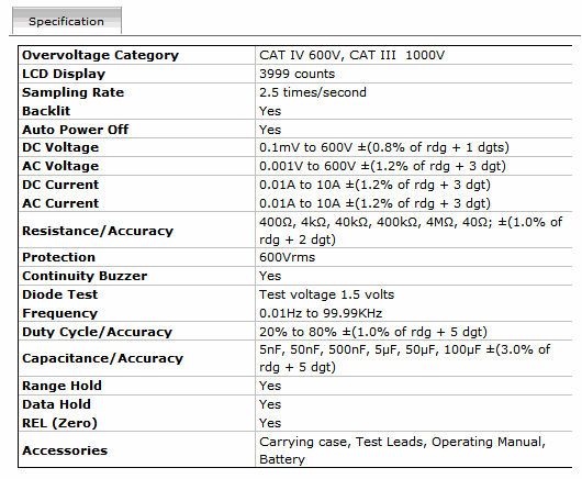 - Accessories: Carrying case, Test Leads, Operating Manual, Battery