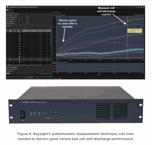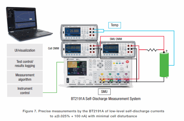 Using a new potentiostatic measurement method, Keysight’s BT2191A Self-Discharge Measurement System for R&D (Figure 7) slashes the time needed for measuring self-discharge of Li-ion cells. For cylindrical 18650 or 21700 cells and other smaller cells, you can quickly measure stable self-discharge current in 30 minutes to two hours. For larger-capacity pouch cells (e.g., 10–60 Ah), it can take one to four hours versus days or weeks using the old method of measuring the change in open-circuit voltage of the cell over time. Key benefits enabled by the BT2191A, with the complementary BT2192A software, include: