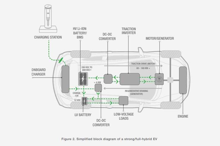 For the strong (or parallel) hybrid and the pure EV (no engine), a high-voltage (HV) bus supplied by a large battery drives the electric powertrain (Figure 2).