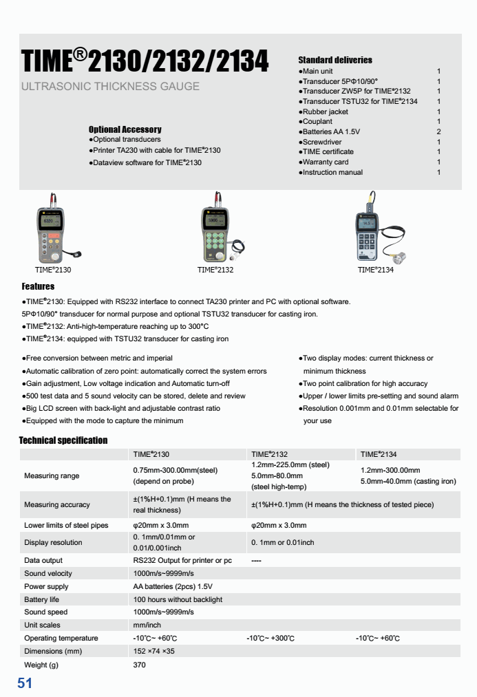 Measuring range: 1.2mm-300.00mm; 5.0mm-40.0mm (casting iron)