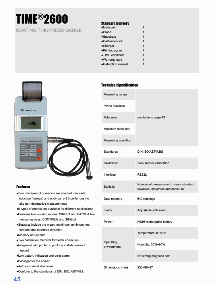 Measuring range: 0-1250 µm; 0-1250 µm, 0-40µm (for chrome plate on copper)