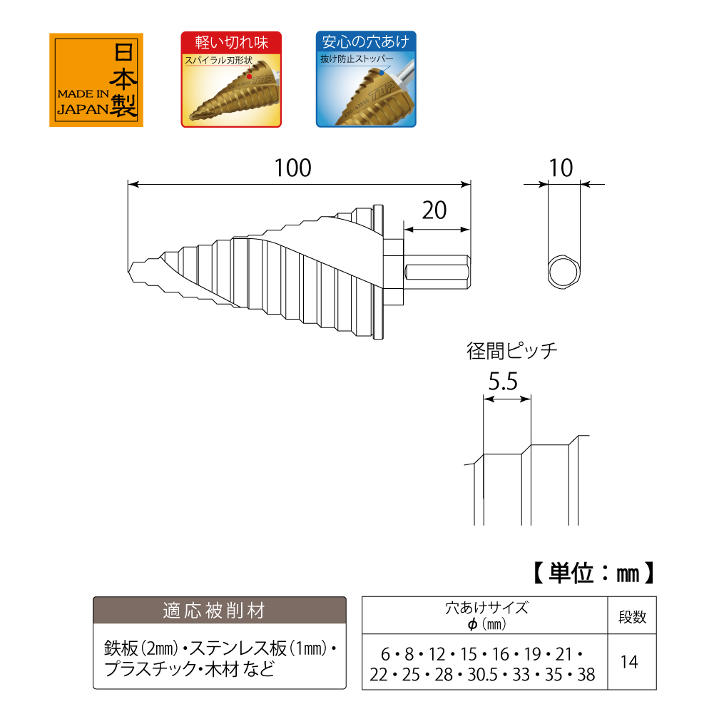 TOP Kogyo ESD-638SG Round shank spiral step drill (100mm) | EMIN.CO.TH