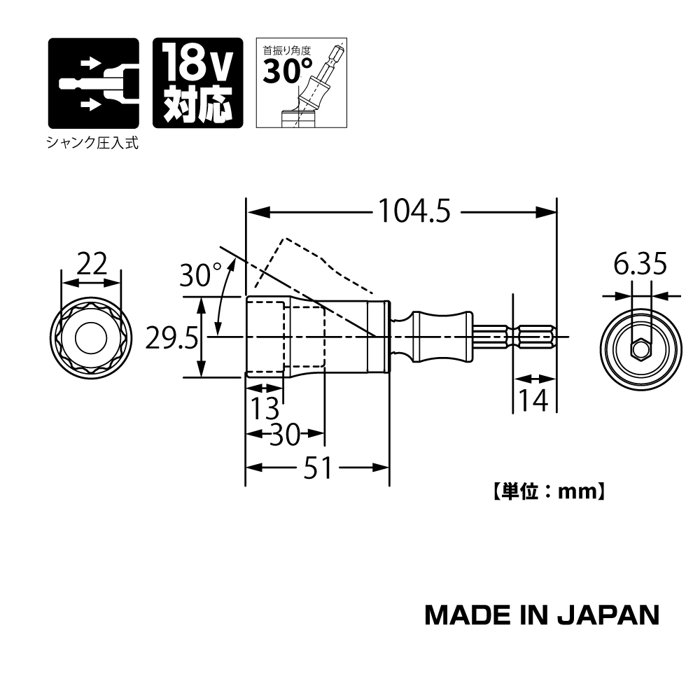 TOP Kogyo EUS-22S Universal Short Socket Bit (22mm, 30°) | EMIN.CO.TH