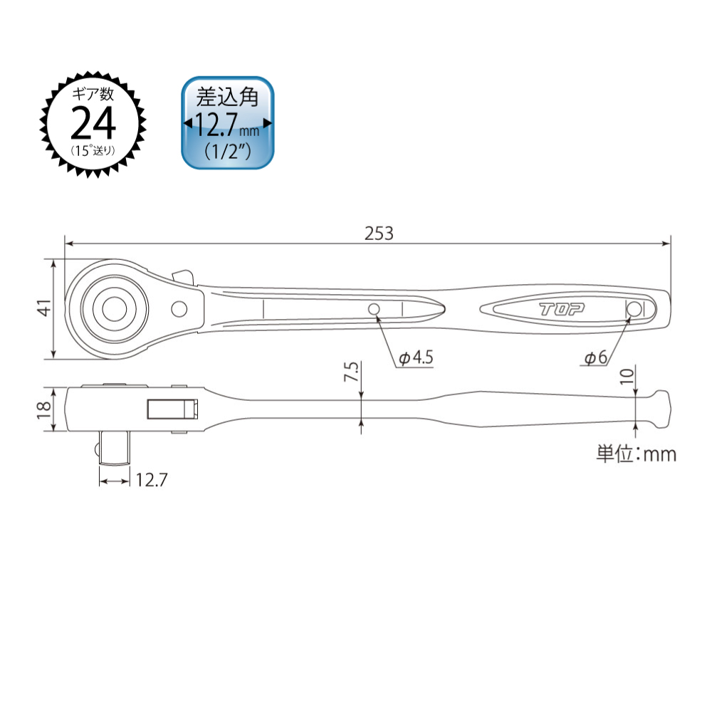 TOP Kogyo RH-4RP Heavy-Duty Ratchet Handle (Push-Release Type) (1/2'', 253mm) | EMIN.CO.TH