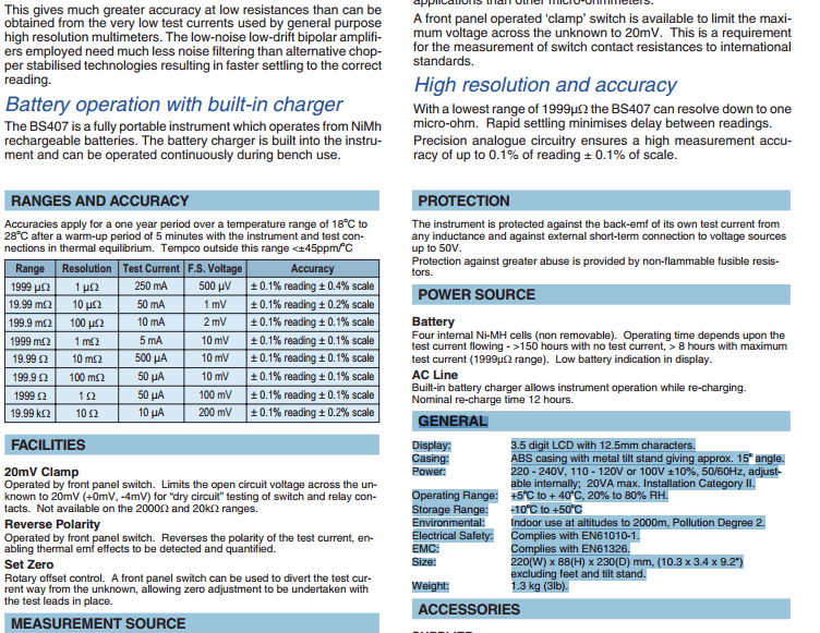 19.99 m 10 µ 50 mA 1 mV ± 0.1% reading ± 0.2% scale