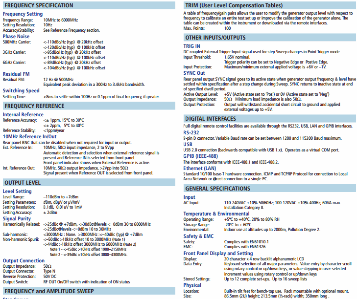 Sweep Triggering: Manual, Ext. signal, timed (0.1 – 999.9sec) or via remote interface.