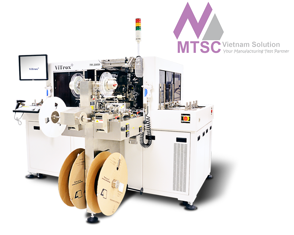 The TR2000i comes with built in taping module with dual taper for fast changeover and tri-nozzle for faster unit pickup which translates to higher throughput of up to 18K (tray to tape)