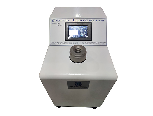 XHF-32 Digital Lastometer: A steel ball is pressed against the centre of the flesh side of a circular disk of leather securely clamped round its periphery. The pressure and the distension produced are recorded at grain crack and at burst.