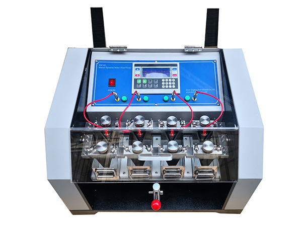 Maeser Dynamic Water-Proof Tester is used standard steel ball placed in the interrior ofleather, and in this way to do water-proof and twist testing. Testing before need to set the number of reverse and automatically shut down when the number arrive, the machine is equipped with a sensor, when the water infiltrate into the interior of leather, it will automatically stop counting time, and display the time of twist.
