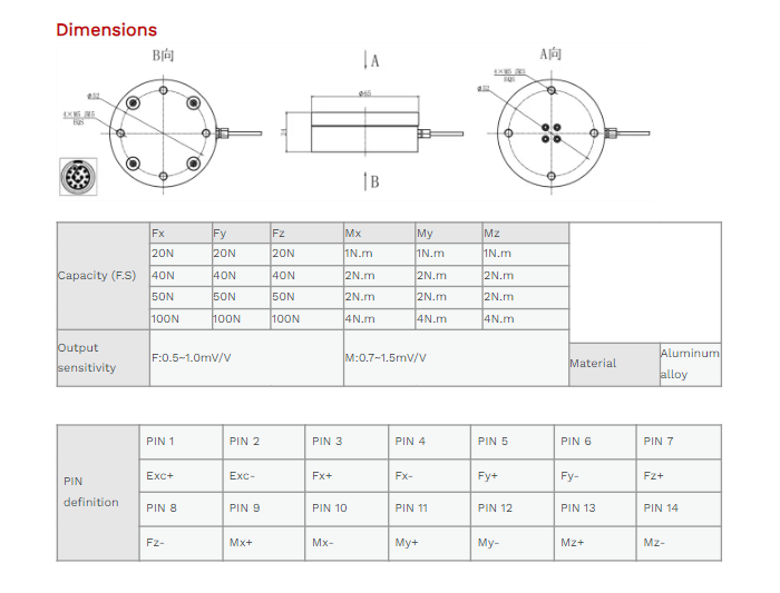 XJCSENSOR X-6A-D65-H24 6 Axis Force/Torque Sensor (20N~100N) | EMIN.CO.TH