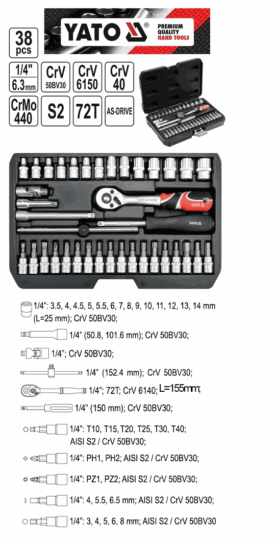 Socket set 1/4" 38 pcs, which was developed to meet the needs of specialized automotive and mechanical services.